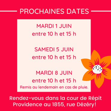 Pour vous soutenir, Répit Providence met à votre disposition : l'équipement pour jardiner, la terre, les végétaux, des rafraîchissements et des collations et, surtout, de la bonne compagnie! Il ne manque que vous!